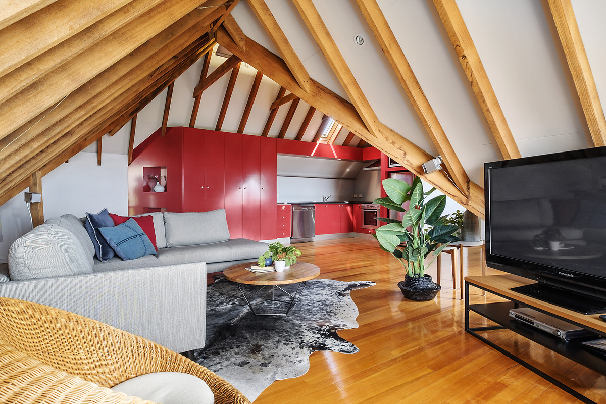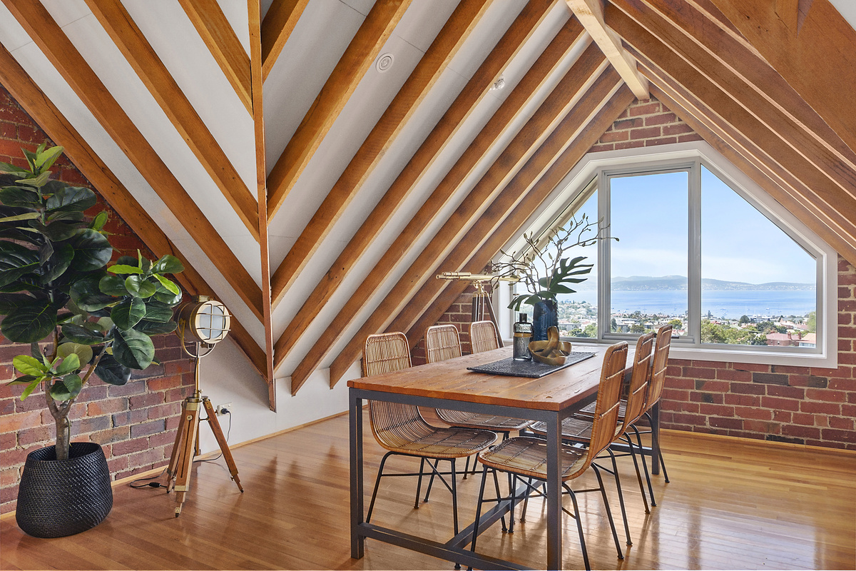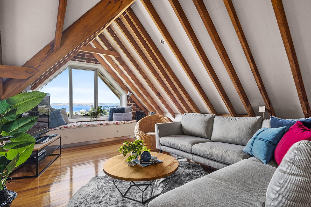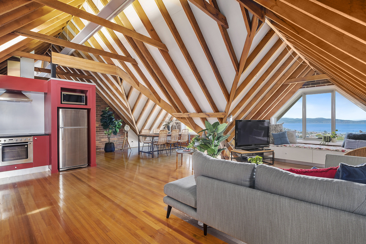 Fully furnished and equipped, this unique loft apartment is built across the entire roof space of an old Arts and Crafts style mansion with breathtaking water views over to the Eastern Shore.