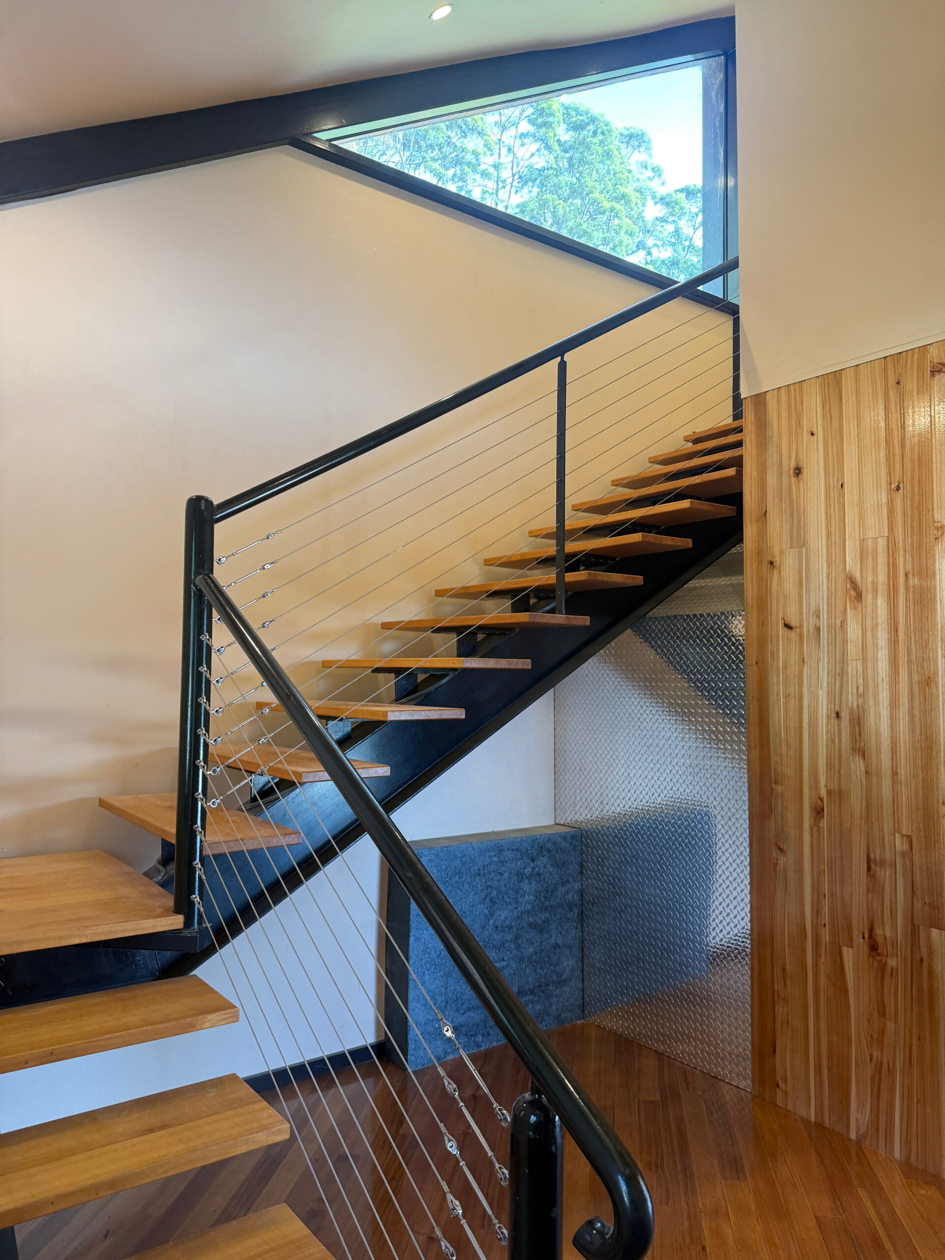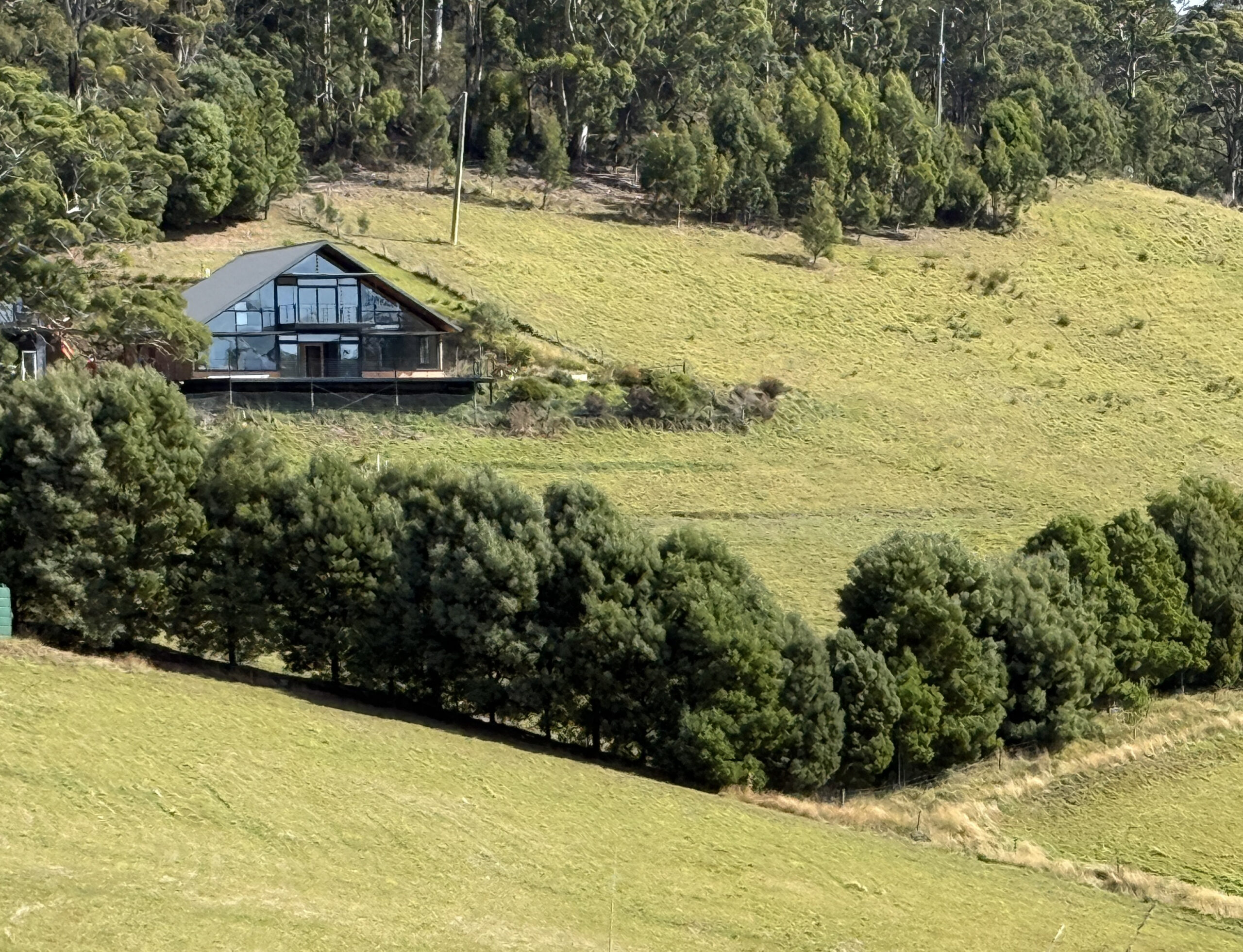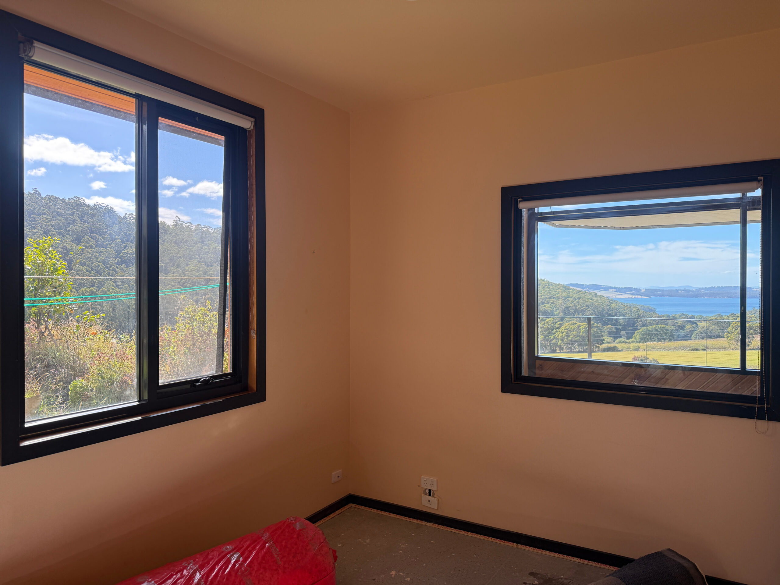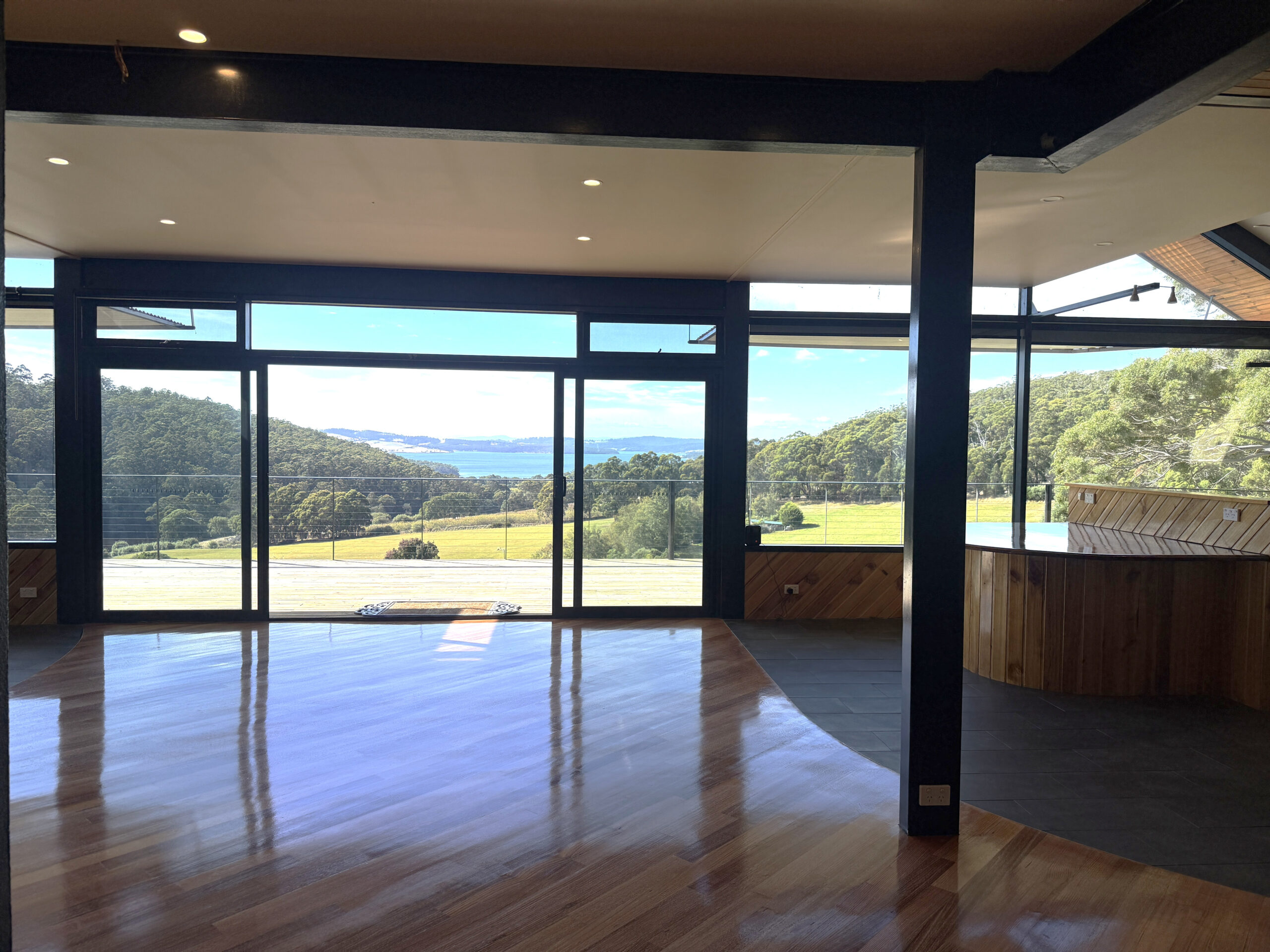 Privately positioned in a peaceful semi-rural setting a few minutes out of Kettering, this architecturally designed home offers a rare combination of space & character, with stunning north-east facing views that look out over the D’Entrecasteaux Channel, Bruny Island & surrounding pastures. Floor-to-ceiling windows and high ceilings ensure the home is filled with natural light and captures the scenery beautifully from almost every room. The main living level is warm and inviting, featuring an open plan kitchen, dining, and living area with a mix of timber flooring and tiles. The kitchen is well equipped & includes a dishwasher, fridge and gas cooktop (bottled gas). This level also includes a third bedroom, ideal as a guest room or home office, along with a bathroom incorporating laundry facilities (with a front loader washing machine) and a separate toilet.