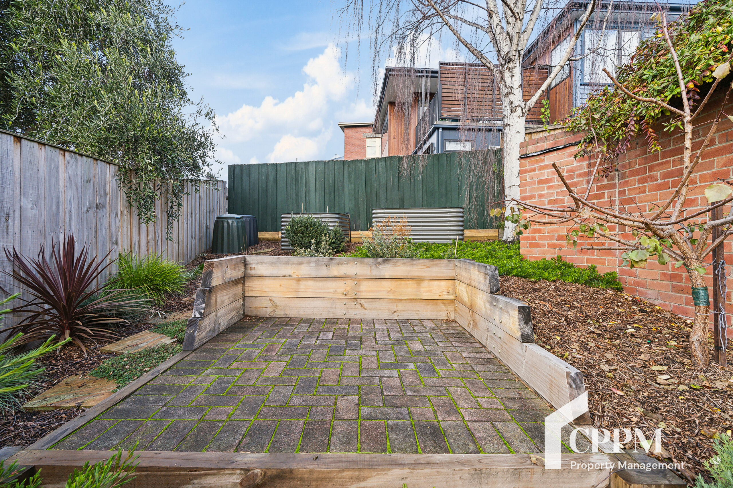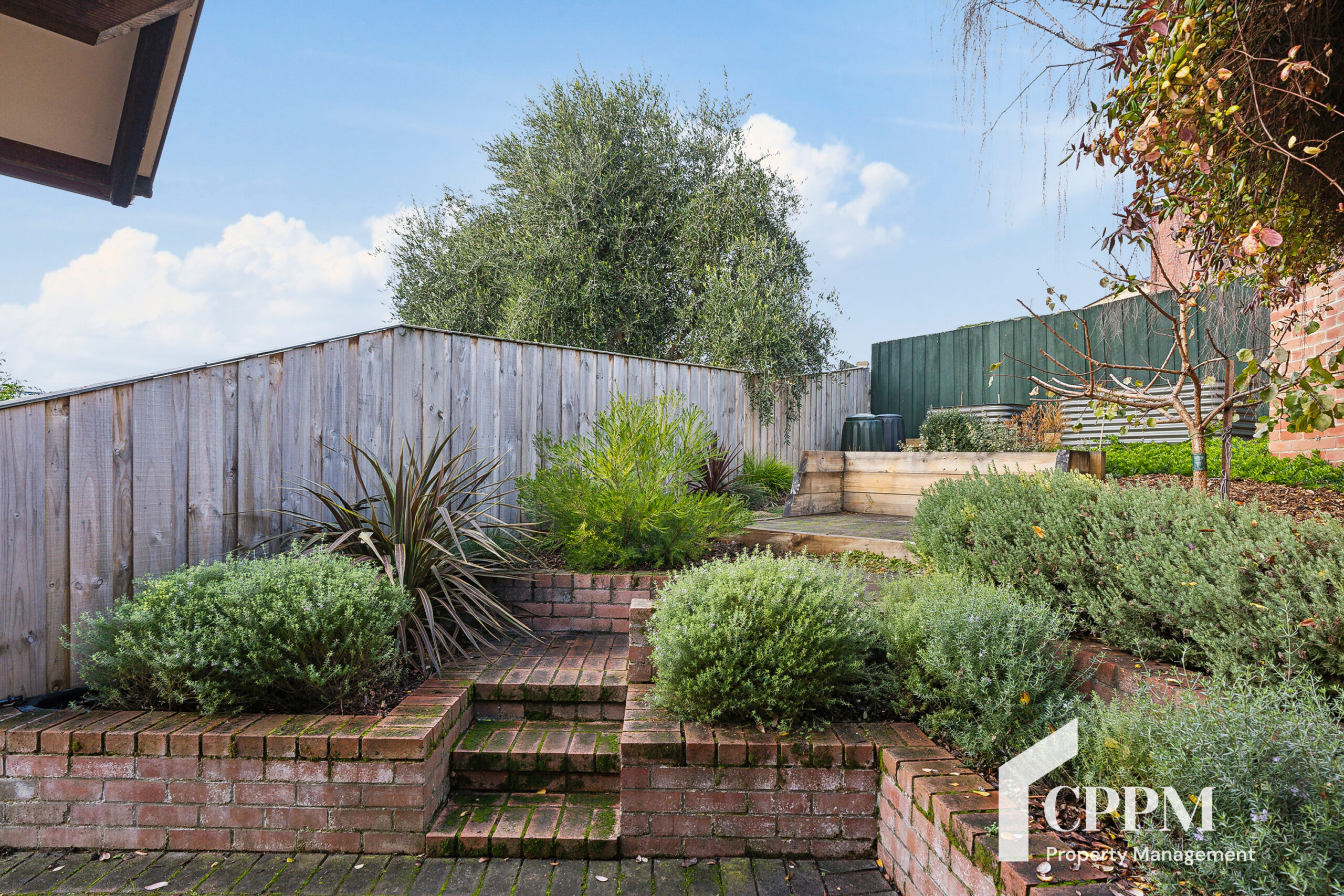 Low maintenance fenced yard with watering system
