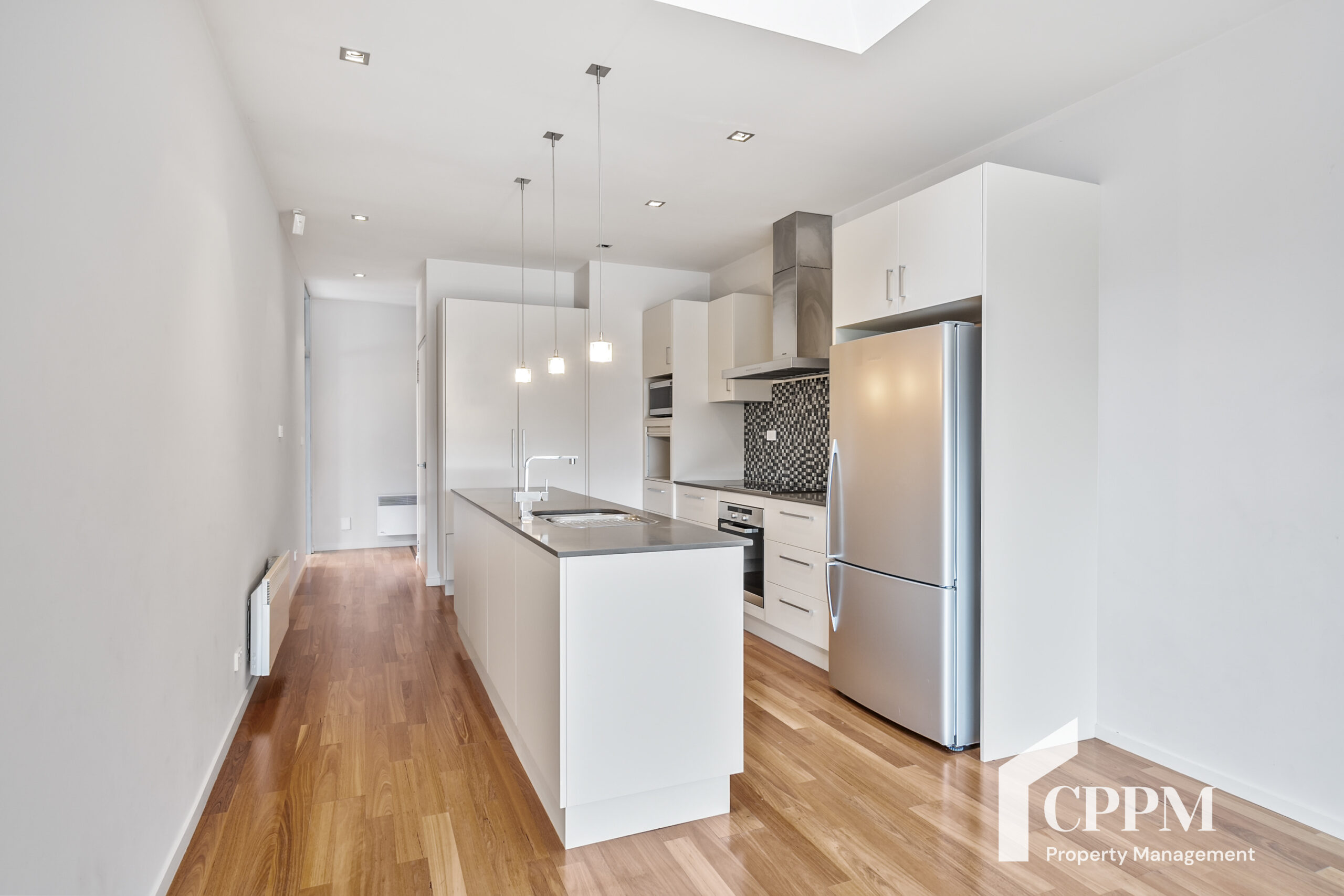Contemporary lighting complements the clean architectural lines, while the designer kitchen features premium Miele appliances and stone bench tops. The open plan living, dining and kitchen space is both stylish and inviting.