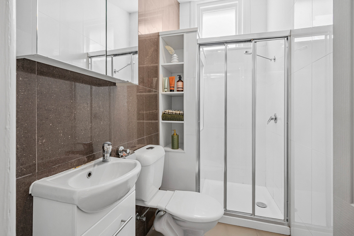 The bathroom off the central hallway provides a shower and excellent storage.