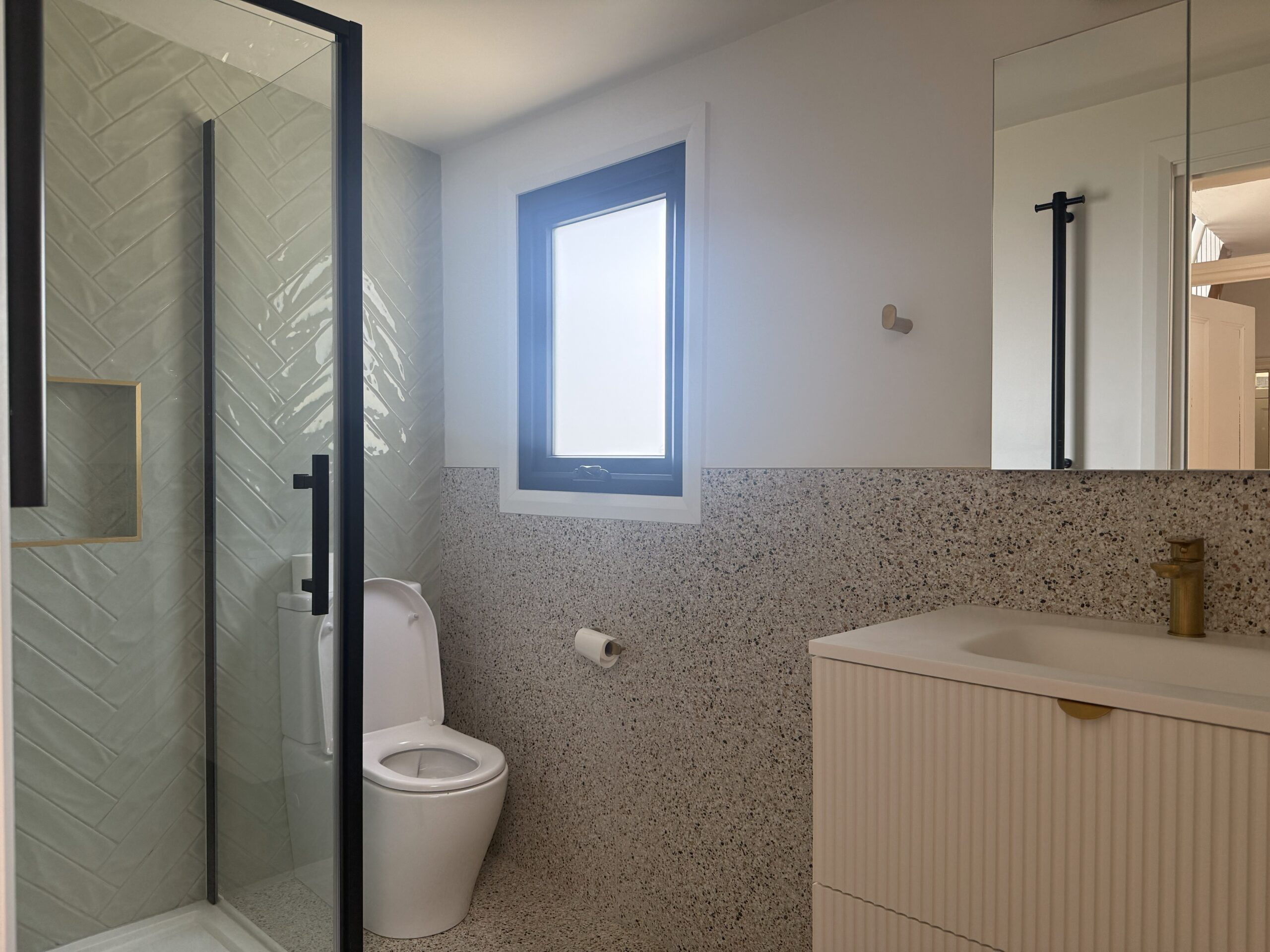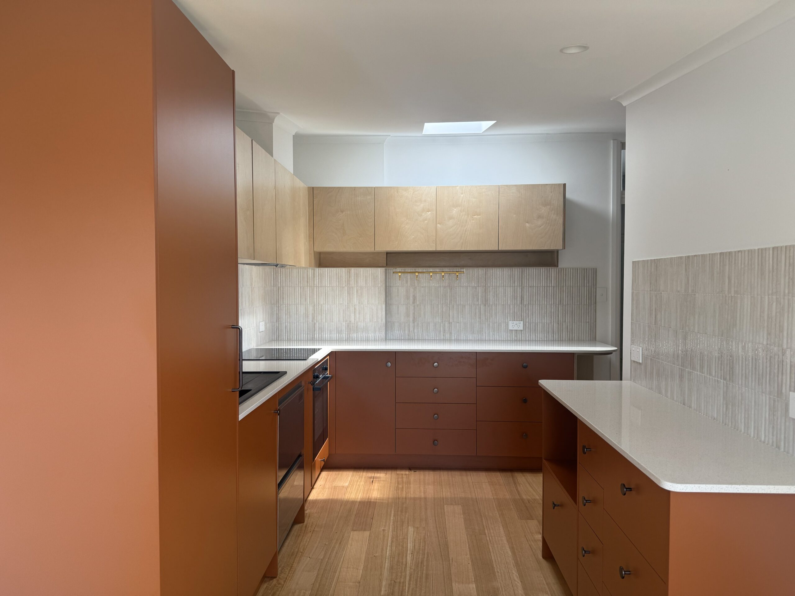 The light-filled, brand-new kitchen features stone benchtops, quality appliances including a two-drawer dishwasher, and a skylight that enhances the airy feel. Living, dining and kitchen areas flow seamlessly, with the lounge offering built-in cabinetry for shelving and storage. Double-glazed windows add comfort and efficiency throughout.