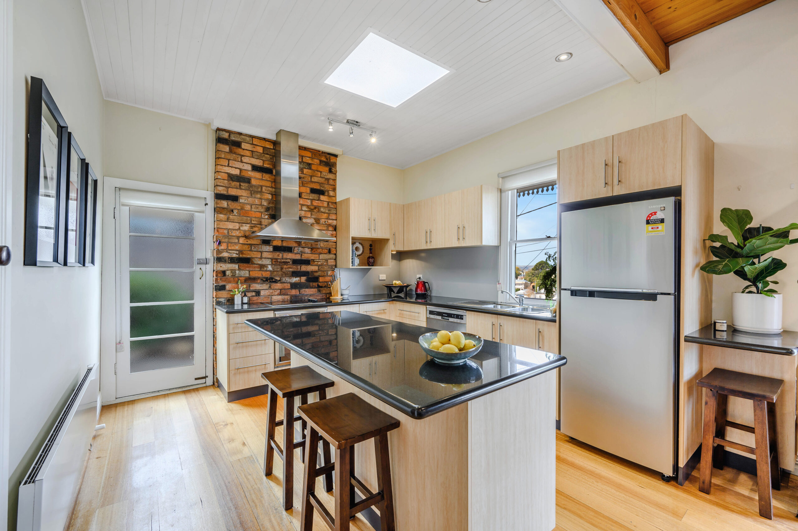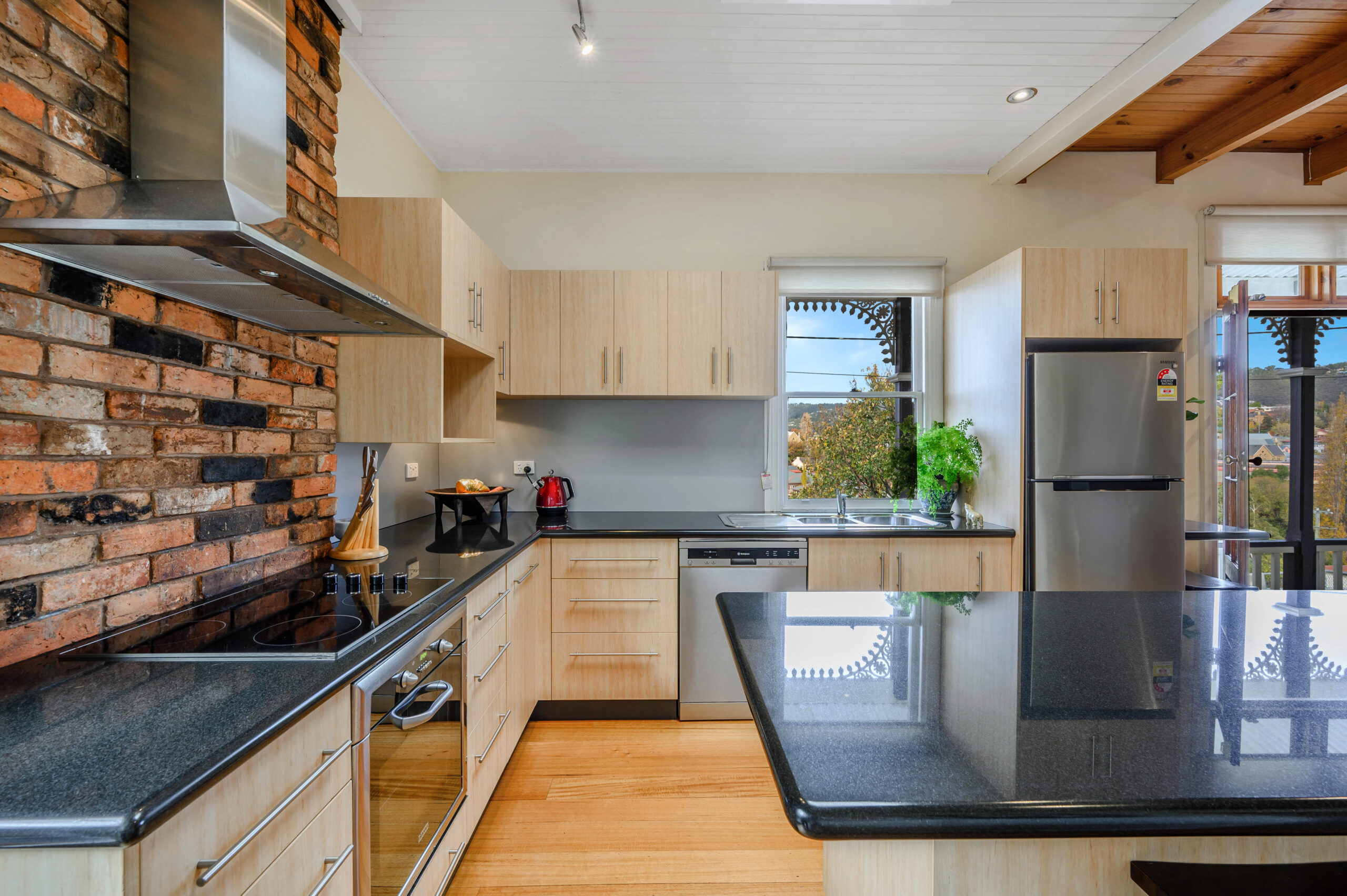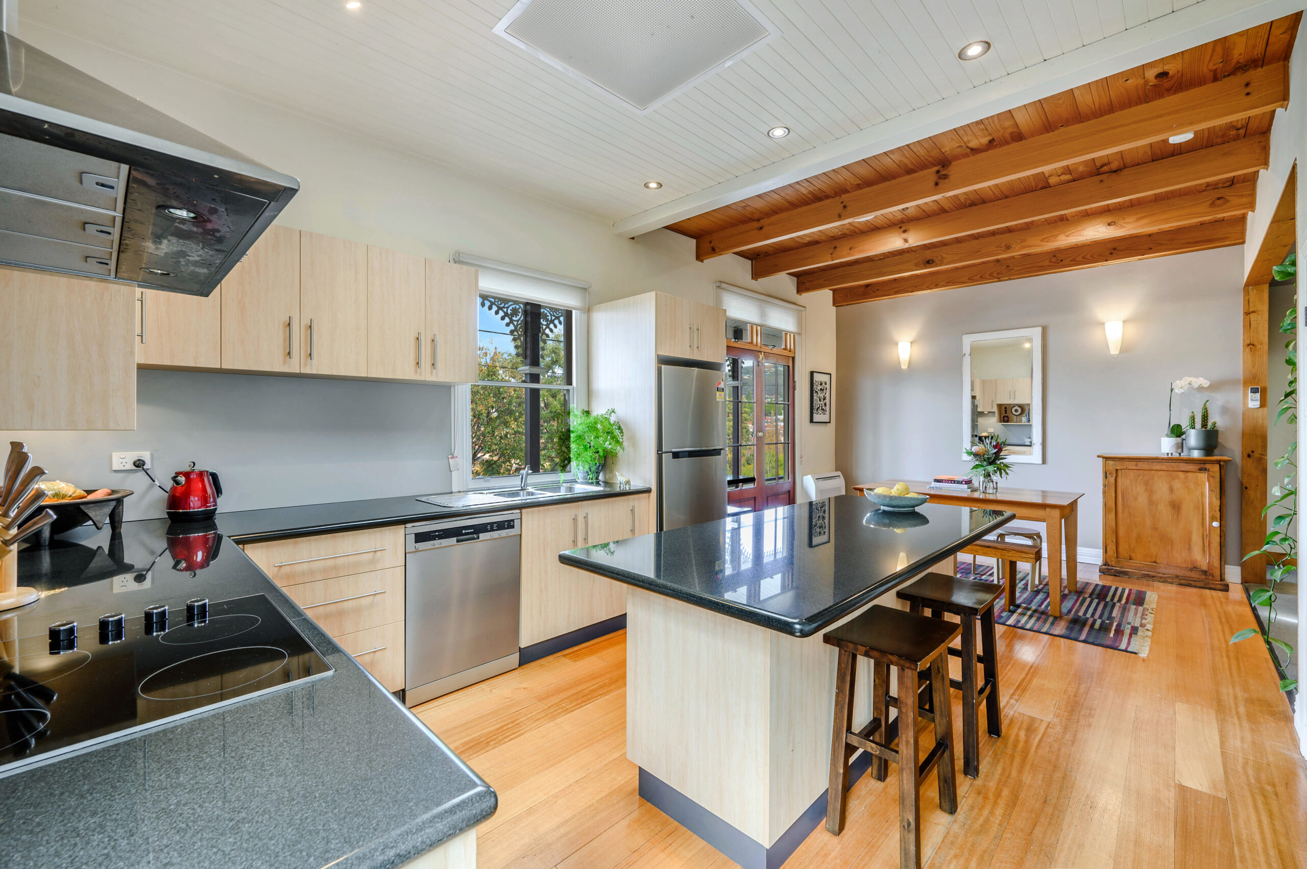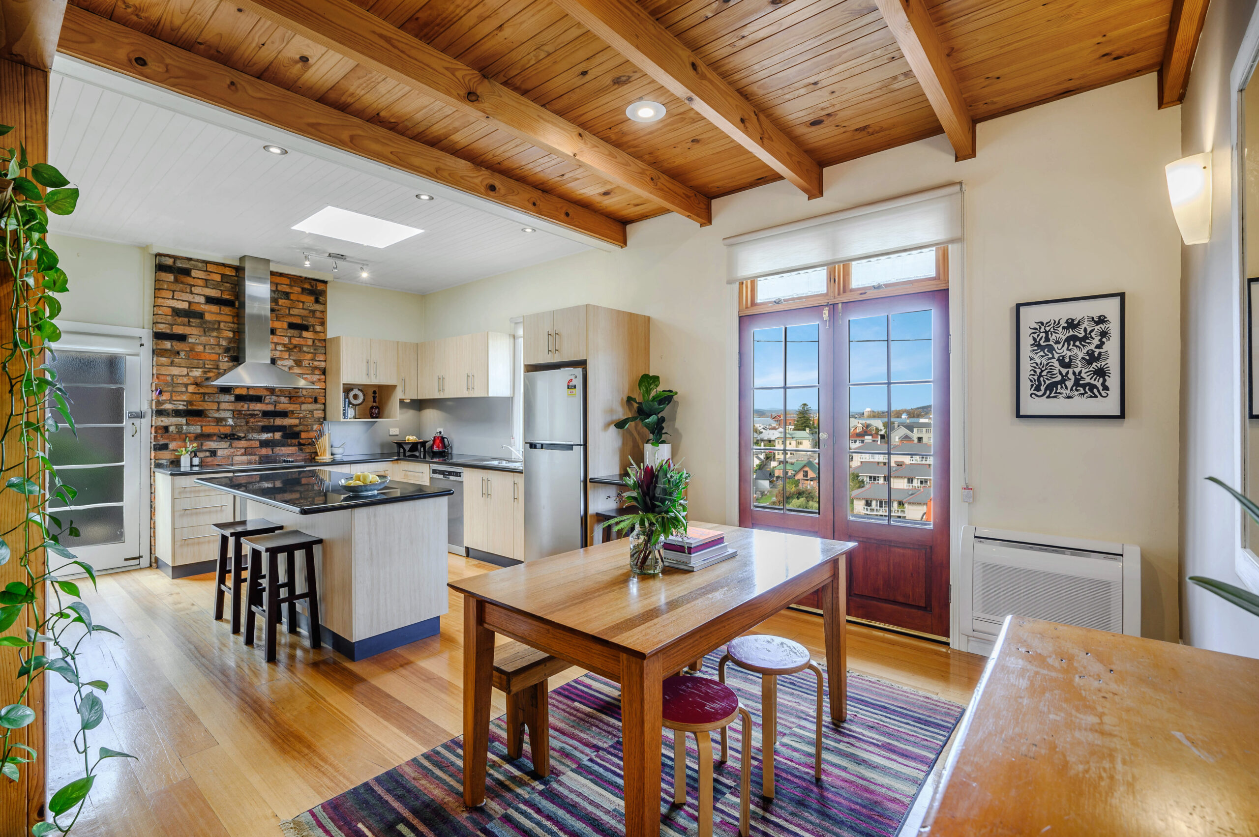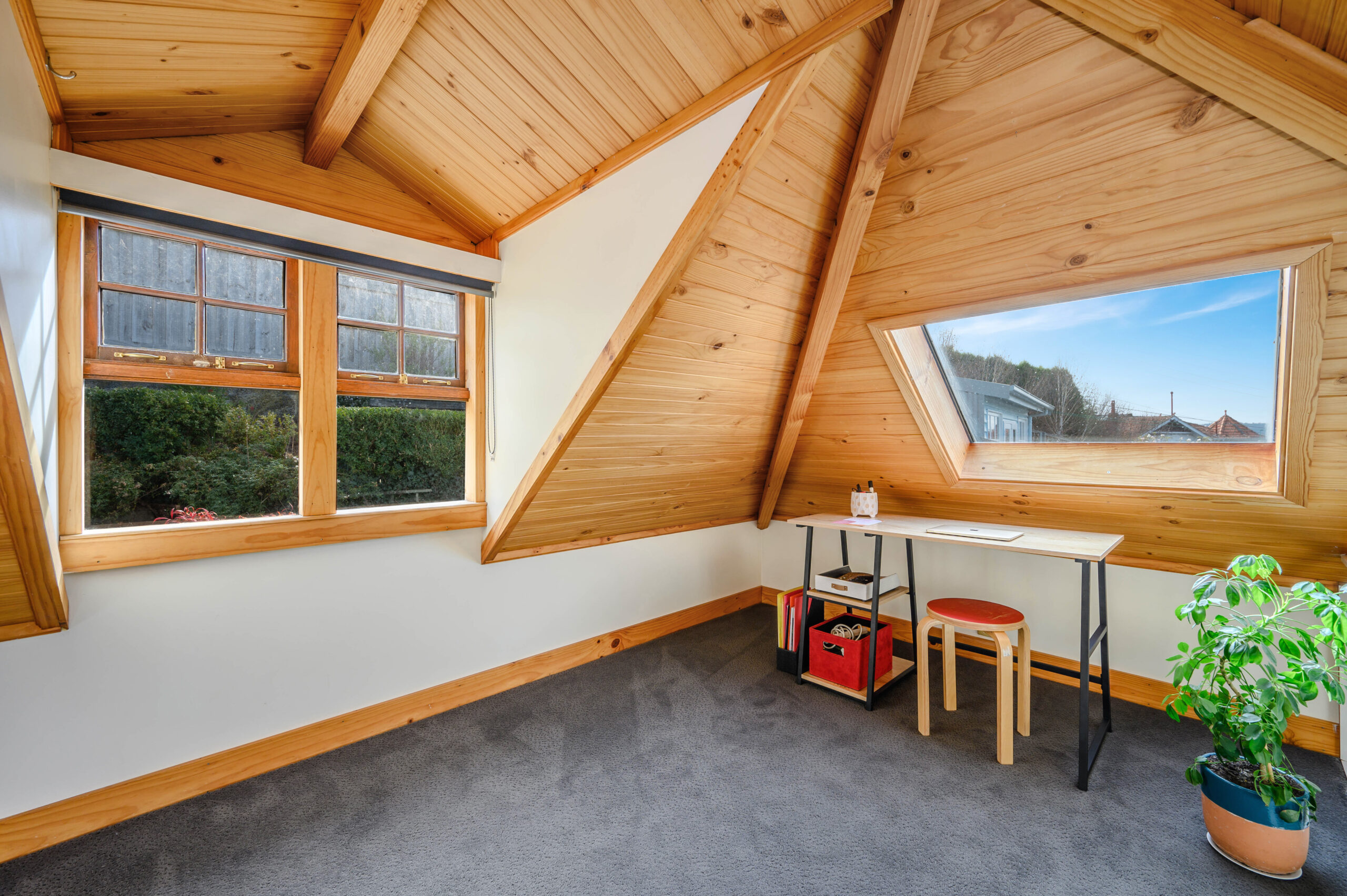 The modern kitchen provides ample space for dining and offers granite benchtops, dishwasher, and island bench. A raised central living room looks out across the cityscape and is cosy with heating and carpet, additionally, the cottage retains warmth with insulation, and Fujitsu air inverter. A timber staircase leads to the pitched-roof loft, an ideal home office, rumpus or bedroom with river and garden views. Two more bedrooms, one with a mirrored built-in wardrobe, and other with walk-in dressing room.