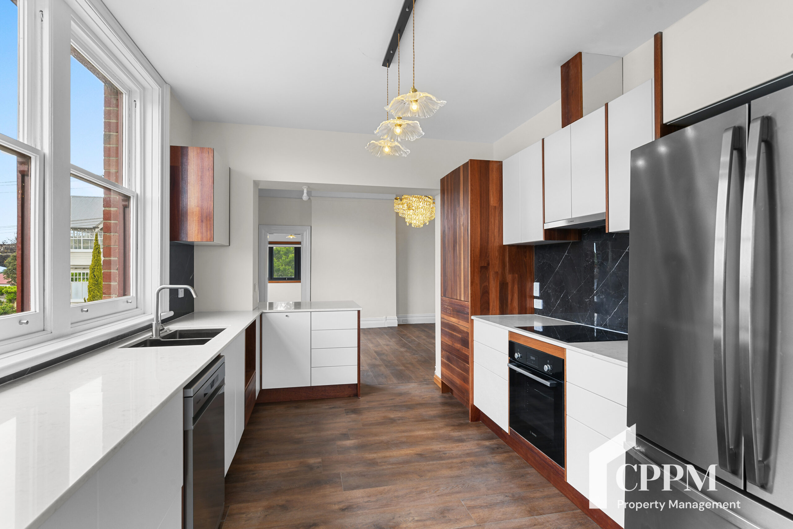 Completely refurbished throughout, the apartment features a bright open-plan living and kitchen area with floorboards, a versatile dining or study nook, and a spacious lounge, all with grand high ceilings. The brand-new kitchen comes complete with custom quality fittings and appliances and includes a dishwasher, fridge, plus a handy storage room.