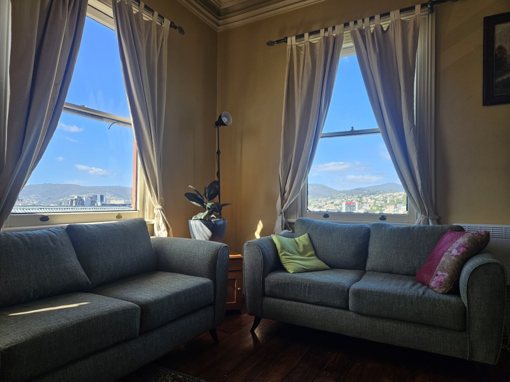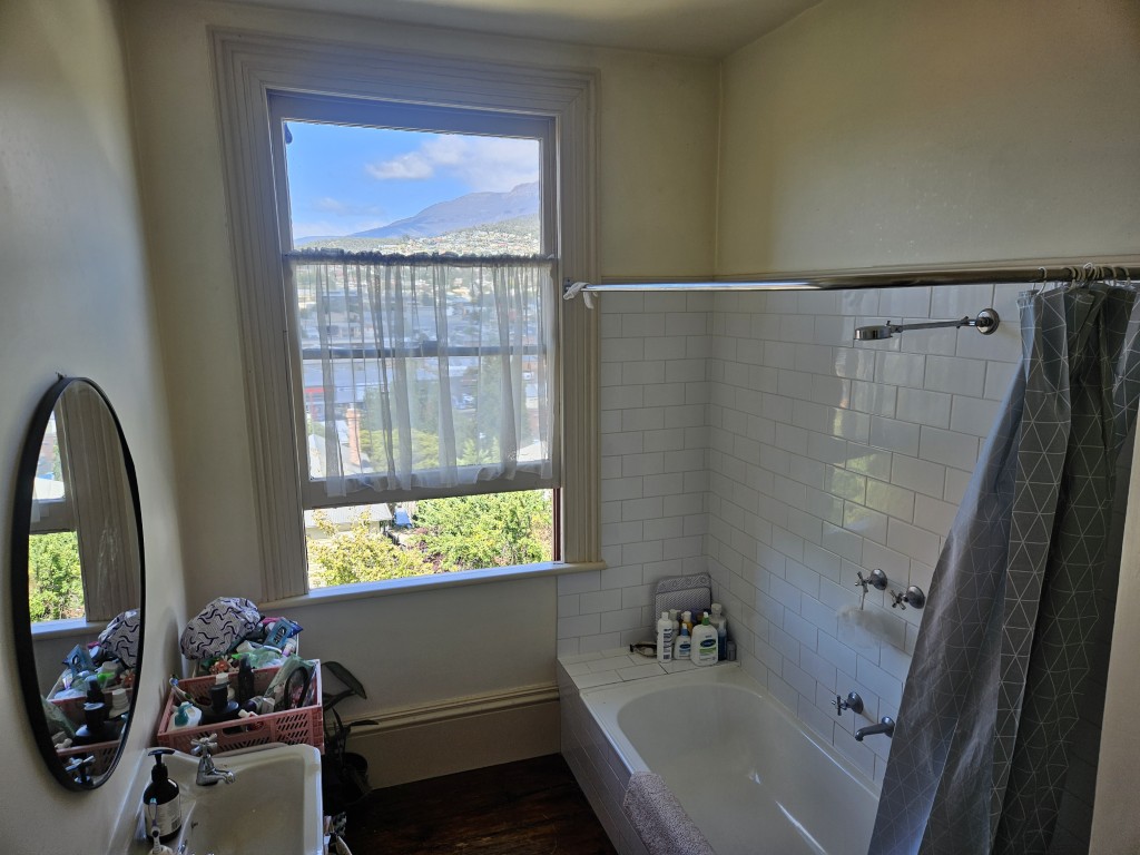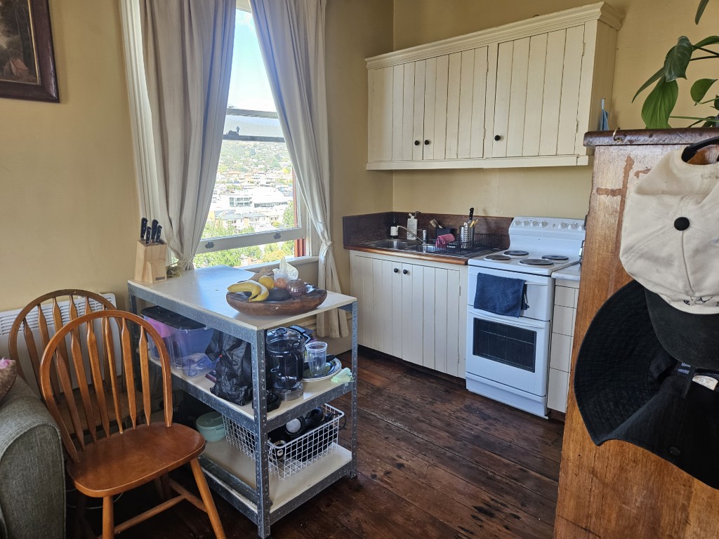 The spacious open plan living and kitchen area enjoys all-day sun and stunning views of both Mt Wellington and the Derwent. The large bedroom includes a free-standing wardrobe and small shelving nook, complemented by an additional study space ideal for work or reading. The bathroom is modern and comfortable, featuring a shower over bath. Electrical heating and a fridge are provided for your convenience.